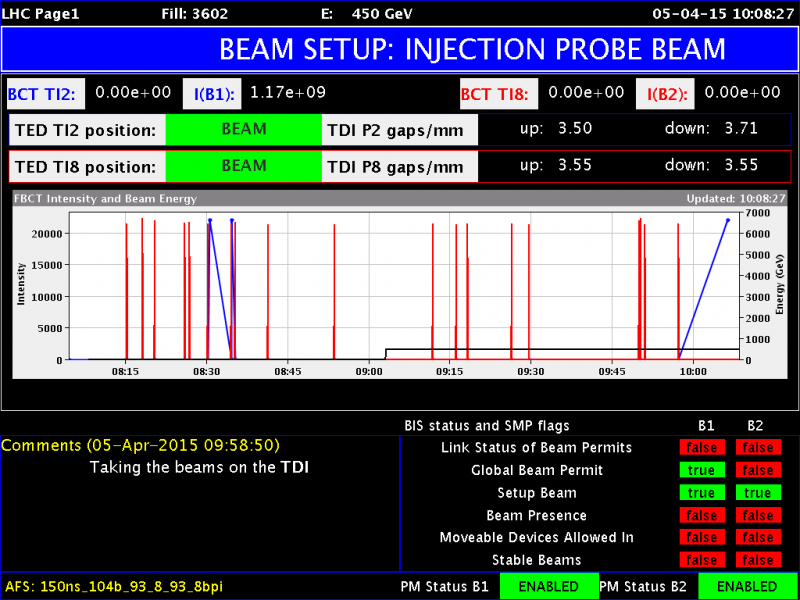 Le Directeur génnral du CERN vient d’arriver pour suivre cette grande journée. L’ambiance est détendue mais électrique à mesure que le Centre de contrôle se remplit. Les opérateurs surveillent l’écran de contrôle du LHC, où l’on peut lire : BEAM SETUP: INJECTION PROBE BEAM. En bas à droite, il est indiqué : Beam permit is green for Beam 1 (B1) - the beam has been authorised, ready to go